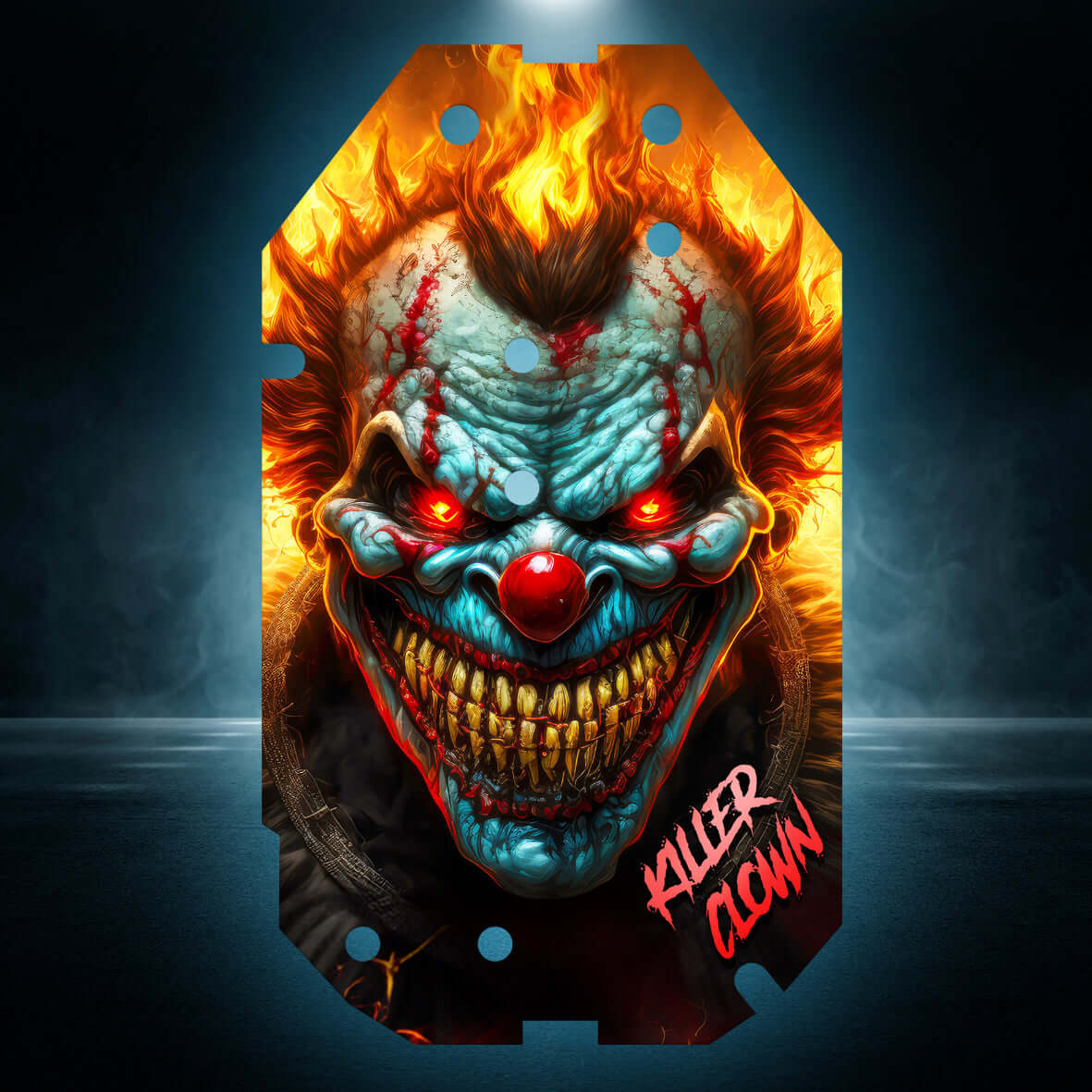 TAMIYA TT02 'KILLER CLOWN' custom RC chassis protector skin with vibrant colors and striking design.